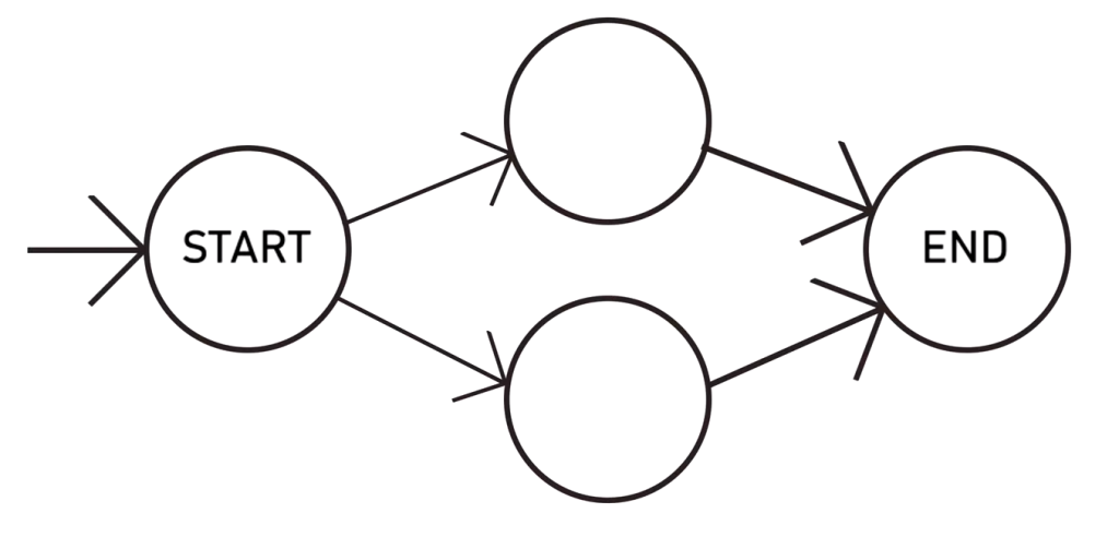 Esta máquina tiene cuatro estados, representados por círculos: el punto de entrada, el punto de salida y dos estados intermedios que por ahora están vacíos. Las flechas nos indican las transiciones entre los estados; podemos ir de Start a los estados intermedios, y de estos a End.
