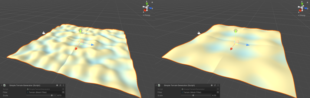 Lo que determina la irregularidad de la superficie de nuestro terreno es la función de Ruido Perlin que le estamos aplicando. Por tanto, el tamaño en XZ de las montañas dependerá del tamaño de la textura que está generando la función de Ruido Perlin: