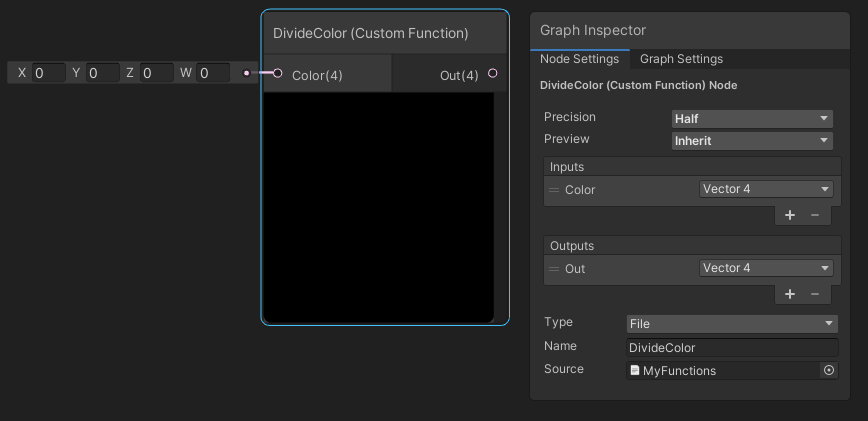 Para crear un nodo personalizado, añadiremos un nodo Custom Function a nuestro espacio de trabajo. Al seleccionarlo, el Graph Inspector cambiará para enseñarnos su configuración: